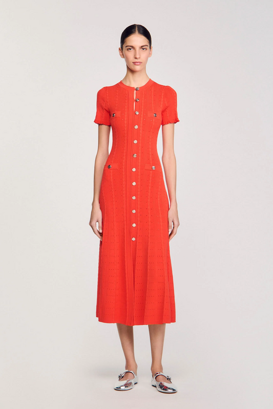 Long Knitted Dress with Decorative Stitching, Round Neckline, Button Closure, Short Sleeves, and Flared...
