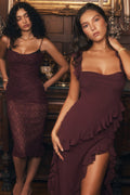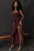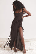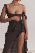 Our 'Ariela' dress is beautifully embellished with fluttery ruffles that add pretty dimension to this ultra sexy silhouette. Cut from lightweight georgette, 'Ariela' is elegant and striking in a rich espresso hue.