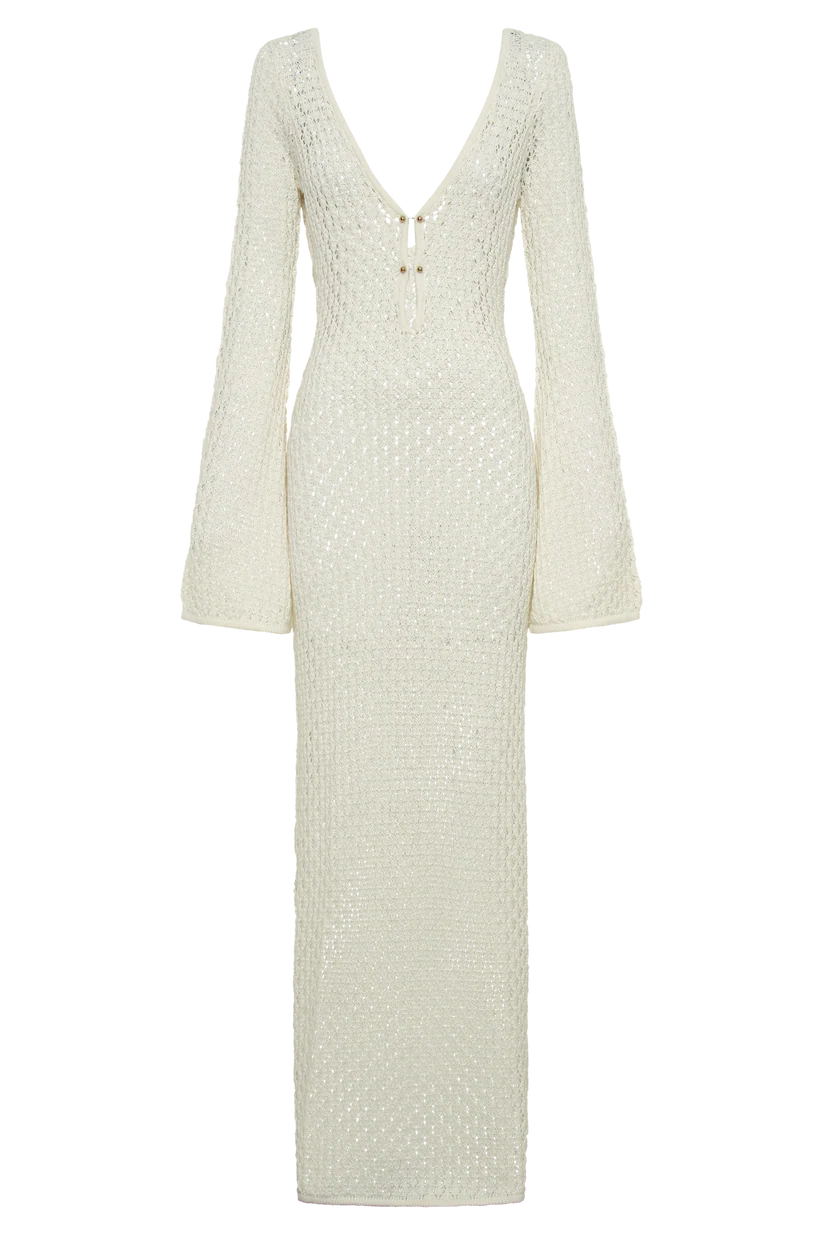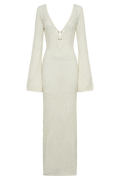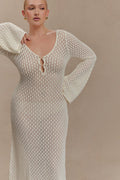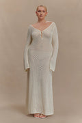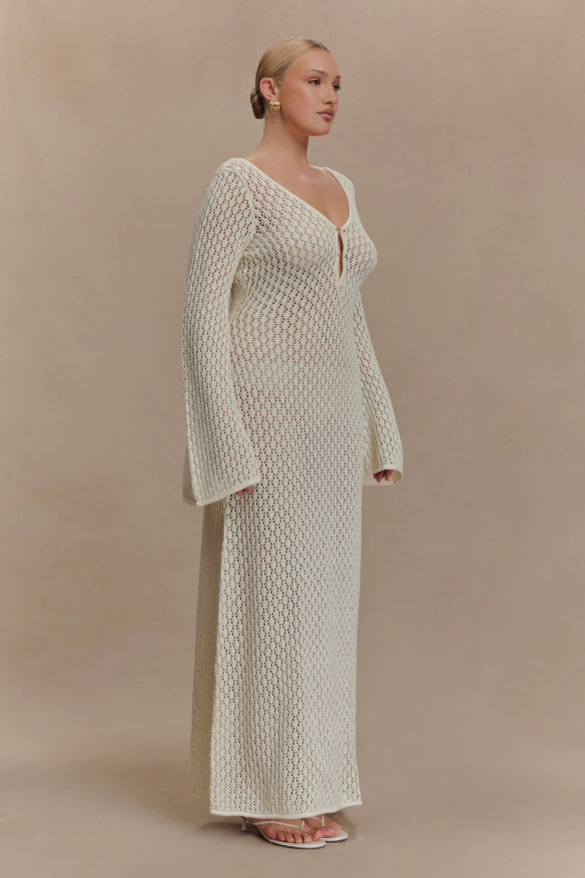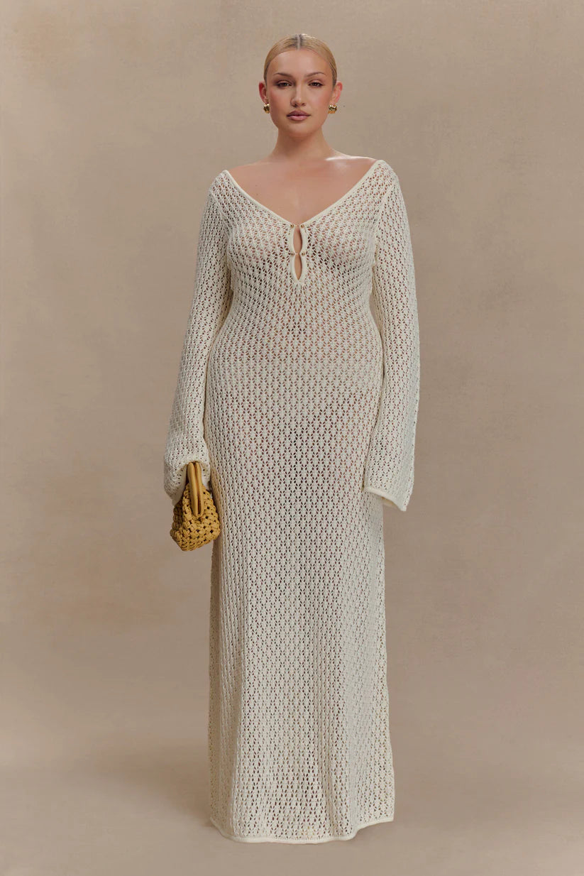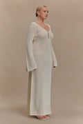 The ARIELLE Crochet Maxi Dress is designed to captivate in every detail. Featuring a deep V-neckline and rounded V-back, this maxi is elevated with two front keyhole cut-outs secured by signature Bellafista gold bar hardware. Long flared sleeves and a raw, floor-length hem create graceful movement, while the sheer crochet knit offers a soft, breathable finish. Crafted in a premium cotton-acrylic blend, it delivers effortless elegance with a touch of radiant allure. Whether for festivals, coastal escapes, or sunset dinners, this dress is made for unforgettable moments.