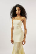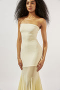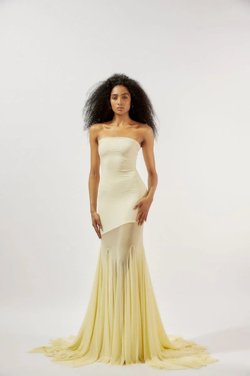 Luxuriously crafted from butter yellow malai lycra, this tube gown boasts elegant mesh panels and a flattering fitted design.