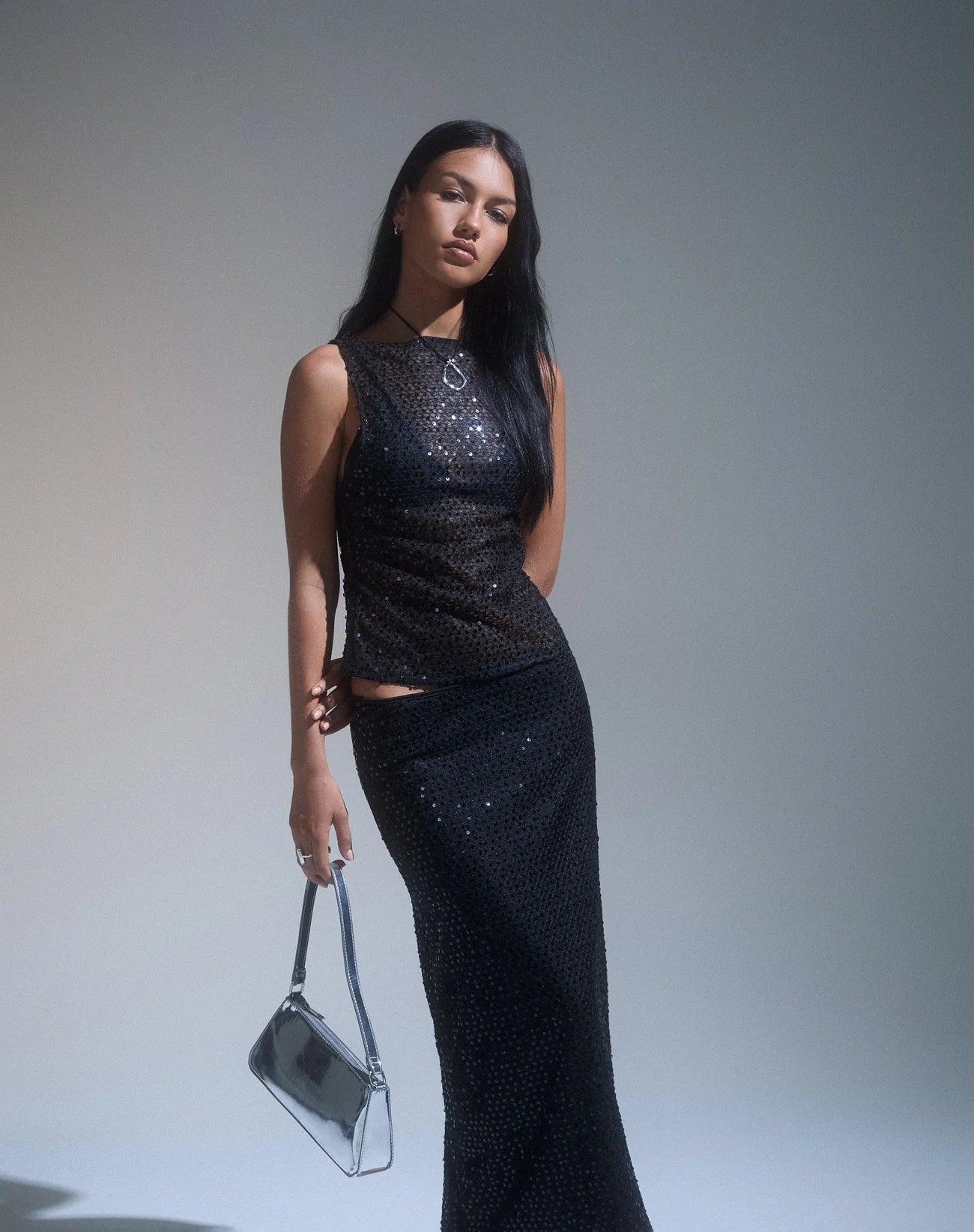 A classic cut with a touch of sparkle. This sleeveless top features a soft knit base covered in shimmering black sequins perfect for effortless day-to-night shine.