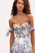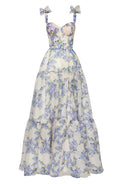 Elviera Dress – Romantic Floral Gown. Features a lace-up corset bodice and floral prints in blush blue and pastel green.