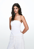 This tube top has a tight fit and an elastic and soft knitted material. It has a twisted fabric on the chest. This tube top comes in off-white.