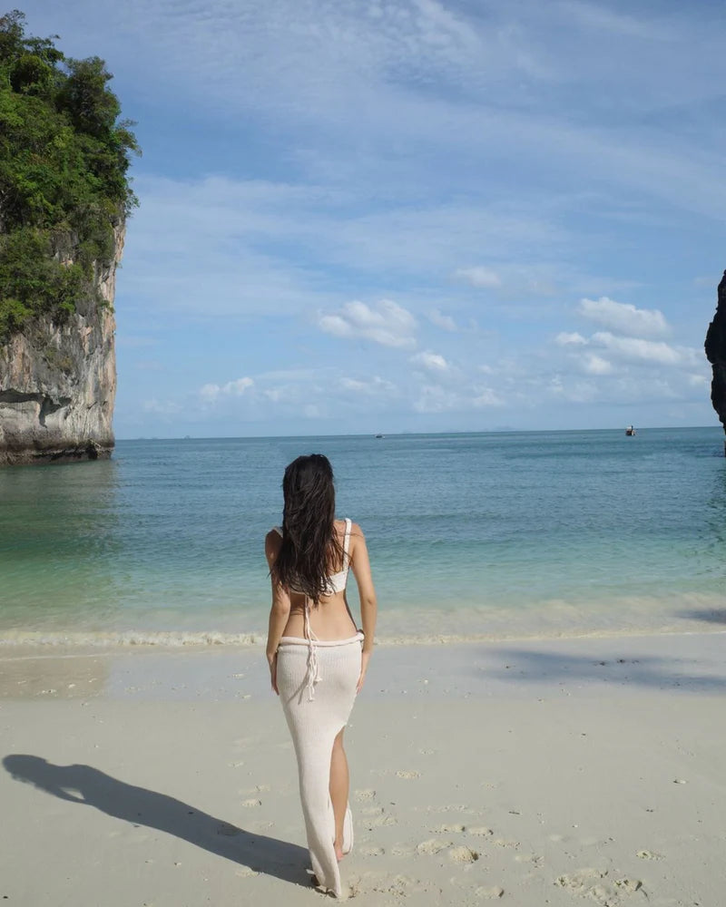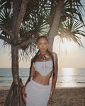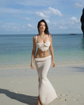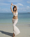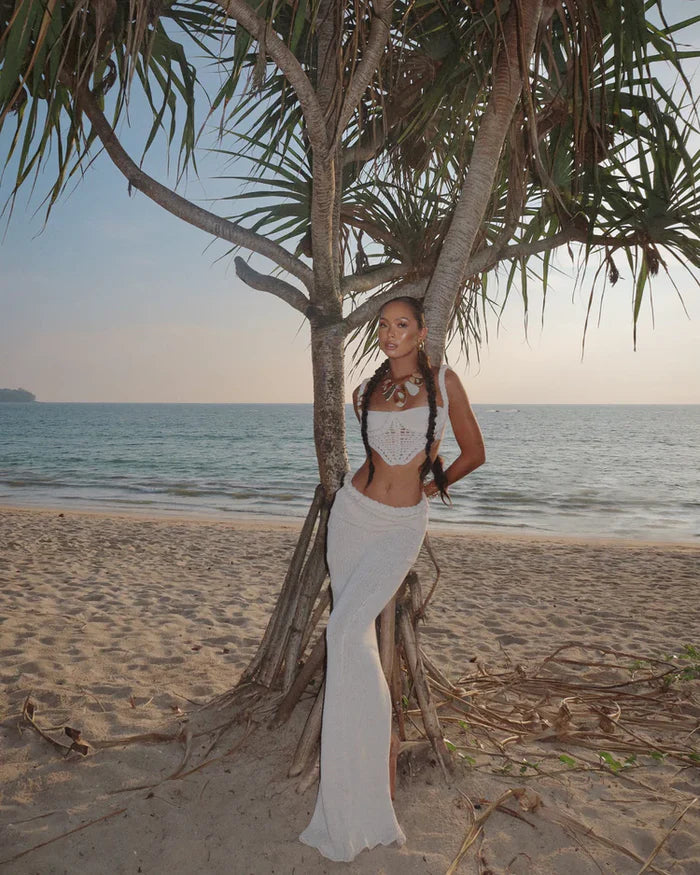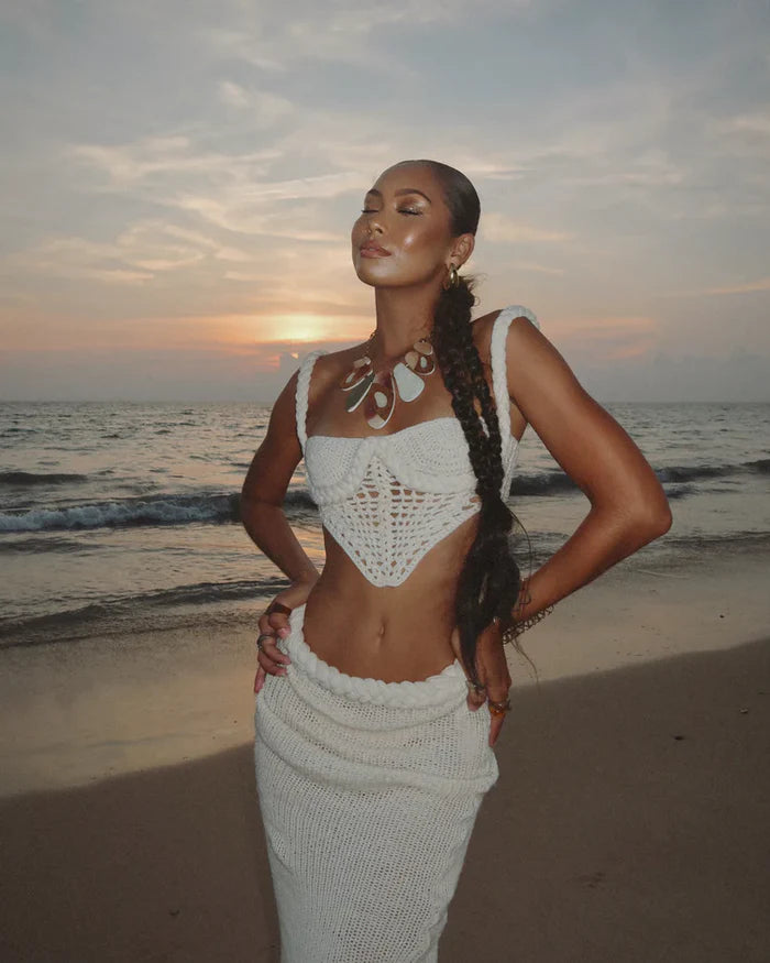 Breathe in the sea breeze and embrace effortless coastal elegance with the Marée 2-Piece Knit Set. Handcrafted with soft, breathable yarn, this set features a delicately structured knit top with braided straps and a statement front tie, paired with a high-waisted, figure-hugging skirt that flows to the ankles with a subtle slit for ease and movement.