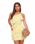 A feminine and playful dress with soft ruffles, an asymmetrical neckline, and adjustable straps. Double-lined for coverage and designed for comfort in warm weather. Best suited for heights up to 169 cm – size up if unsure.