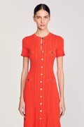 Long Knitted Dress with Decorative Stitching, Round Neckline, Button Closure, Short Sleeves, and