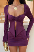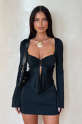 Turn heads in the Sienna Long Sleeve Mini Dress. Featuring a front cut-out, ruched bust, draped centre panel, flared sleeves, and a lace-up open back, this stretchy bodycon mini hugs every curve for an effortlessly striking look.