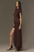 Draping details over the shoulder and waist for a sculptural effect