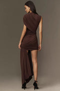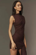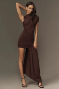 The Valencia Noir Draped Mini Dress is the epitome of effortless elegance. Crafted from lightweight jersey fabric, this gorgeous mini dress features draped details that flow gracefully over the shoulder and waist, creating a flattering silhouette. The funnel neck adds a touch of sophistication, while the asymmetric sash that falls from the draped skirt adds a dramatic edge.