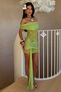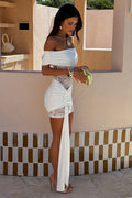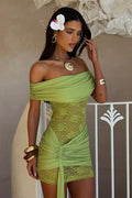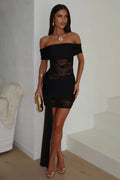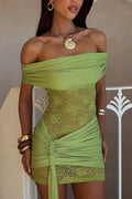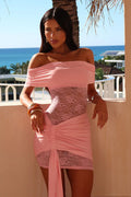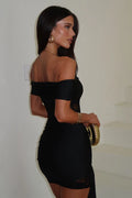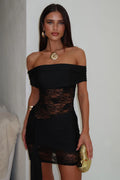 Turn heads in the Valencia Off-Shoulder Dress! This playful mini features delicate side ruching and a lace torso for a flirty, feminine touch. The fully lined bust and adjustable waist wrap tie create a flattering silhouette. Perfect for your next night out—simply pair with heels and a stylish bag to complete the look!