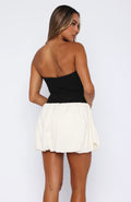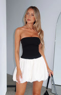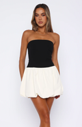 A flirty mini dress with a dreamy skirt. The Diamond Dust Mini Dress Black/Cream features a drop-waist fit bodice, grip tape, structured crepe fabric, gathered bubble skirt design, hidden centre back zipper with hook & eye, mesh lined fabric and strapless design.